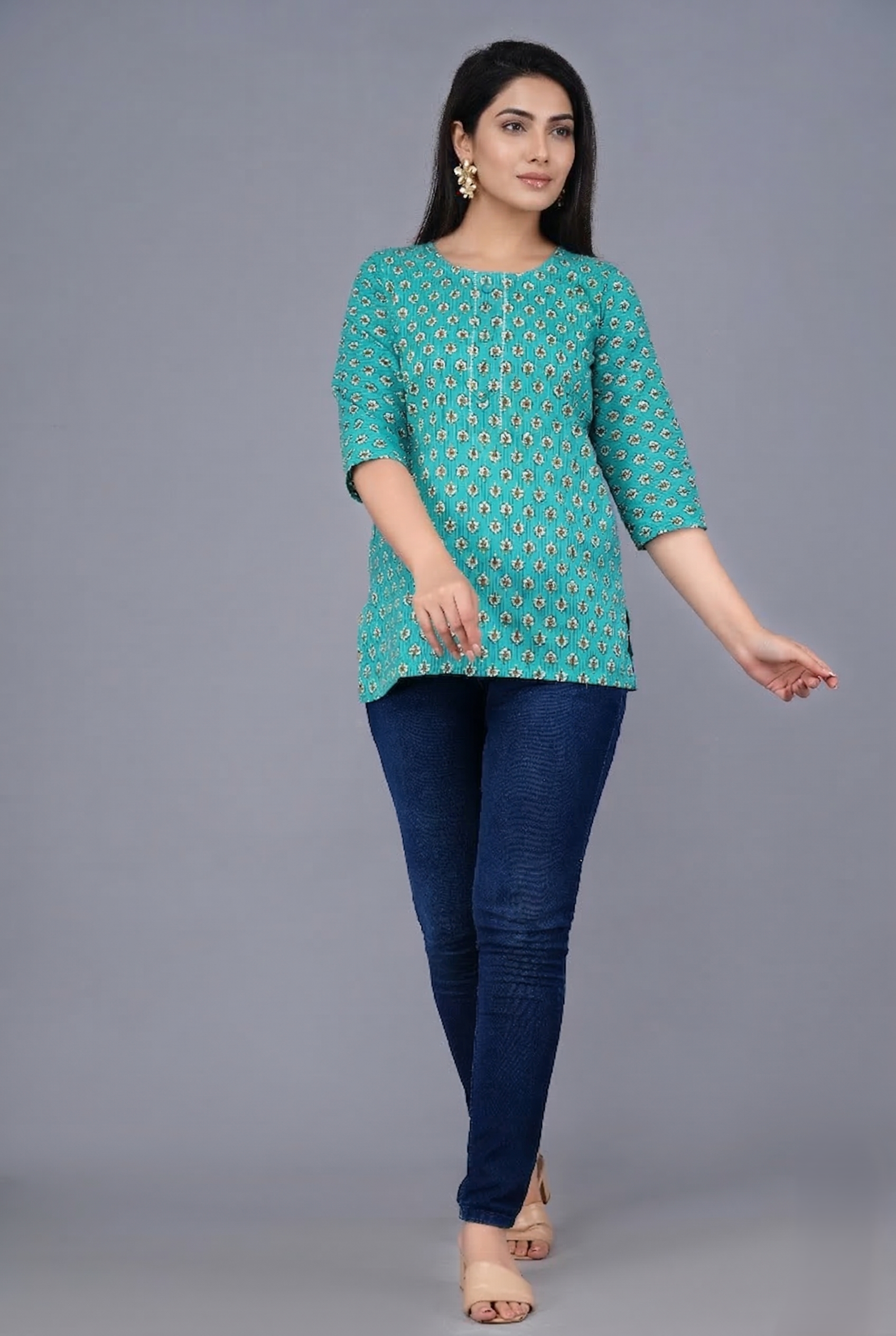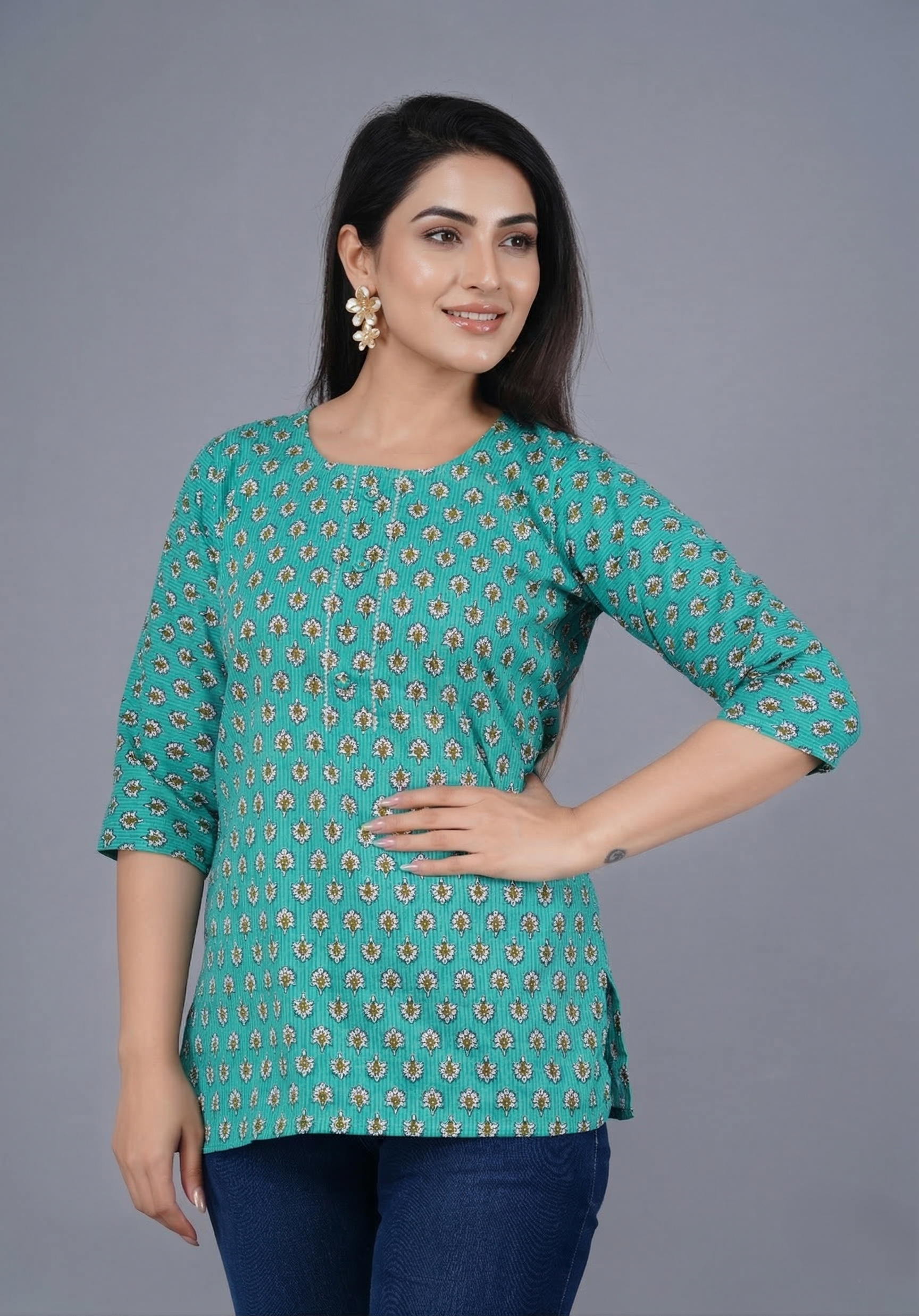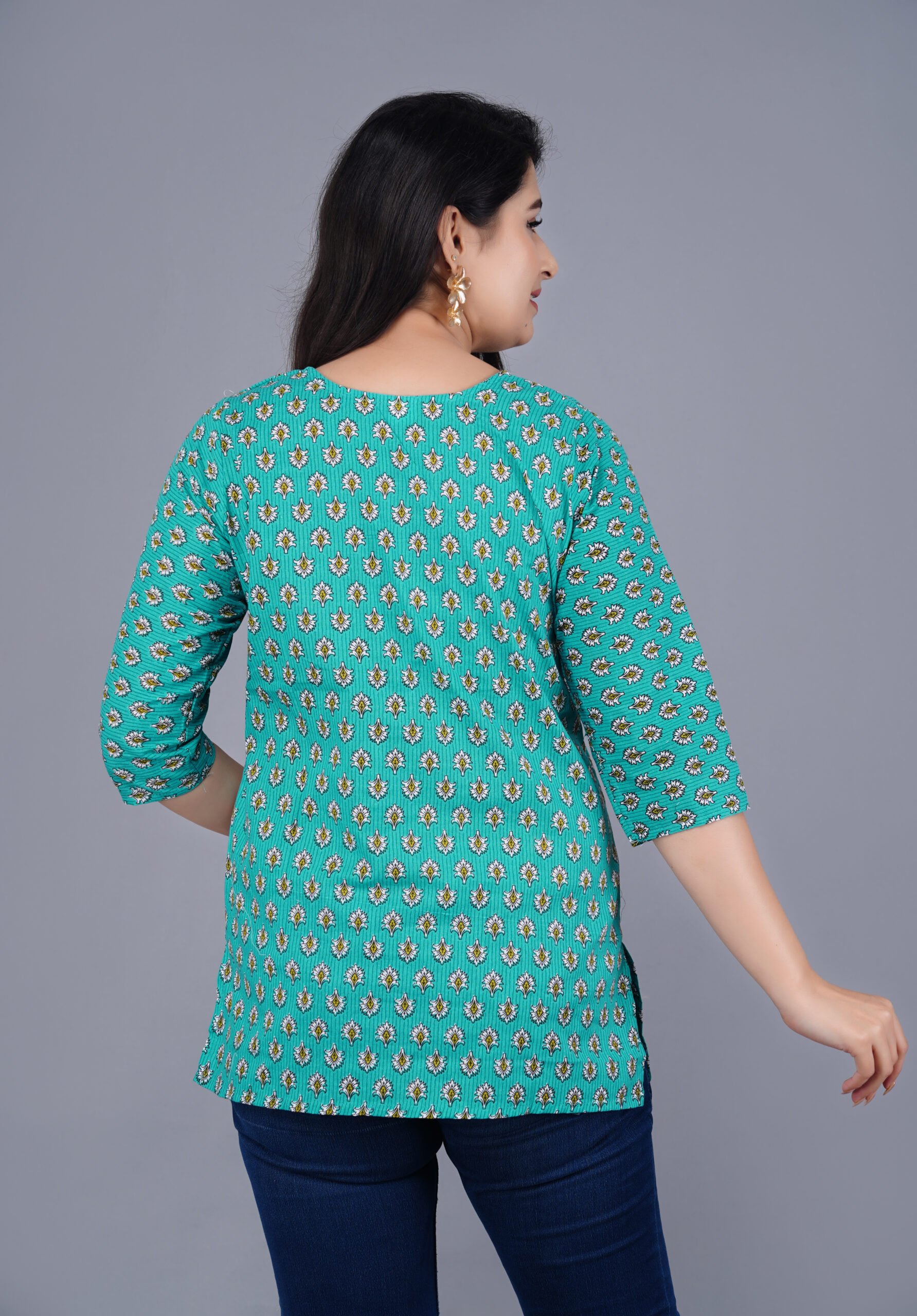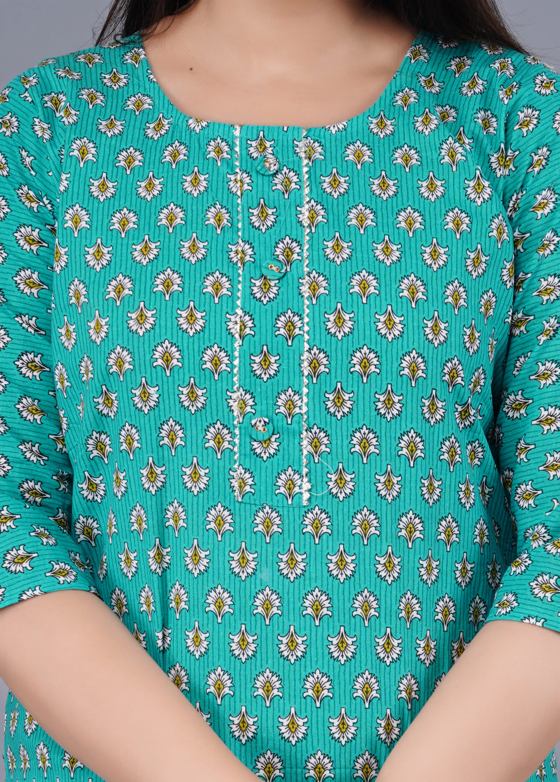 Featuring a delicate ethnic floral print on a rich green base, this printed cotton kurta for women adds a fresh and graceful charm to your wardrobe. The regular fit, combined with a classic round neck and three-quarter sleeves, offers a flattering silhouette that suits every body type.
